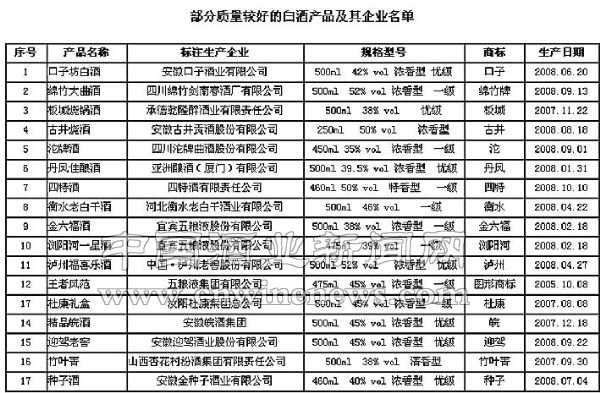 日前,中国保护消费者基金会对市场上销售的部分白酒采样,并委托国家认证认可的质量检测机构,按照国家相关标准进行了检测比较。大部分品牌白酒质量较好,例如安徽口子酒业有限公司生产的口子坊白酒等。检测也发现一些不合格的白酒,例如标注汝阳杜康集团总公司生产的杜康酒(型号规格:450 ml 42% vol 浓香型批号或生产日期:2006.10.15 ), 经检测发现该样品按GB/T10781.1-1989标准检验不合格(名单见下表)。