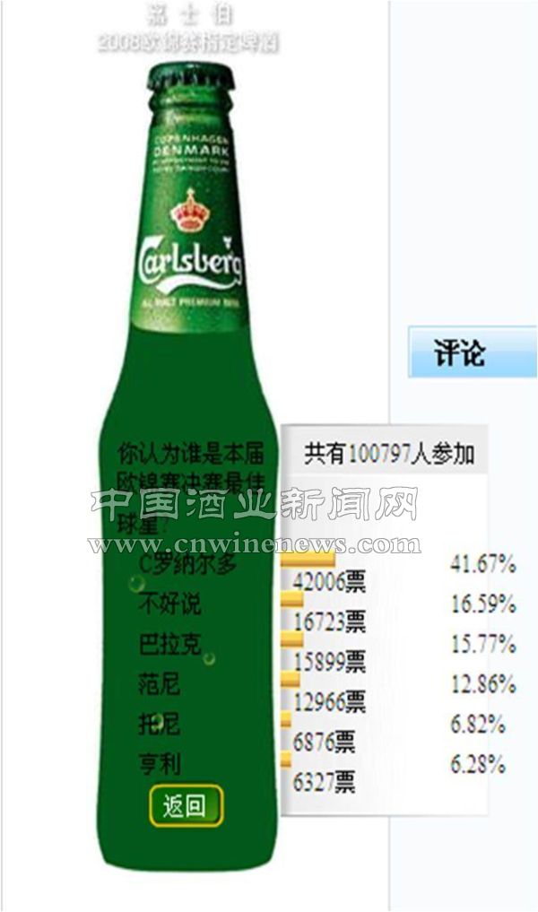嘉士伯在本次营销中充分利用网络的交互性,在欧洲杯专题首屏通栏及嘉士伯调研广告中,加入了网友竞猜活动。通过设置一系列与比赛相关的问题,让网民进行竞猜及展望。新浪网站为嘉士伯活动制作的flash调查器统计,共有数十万人次参加调查、点击率日均过万。