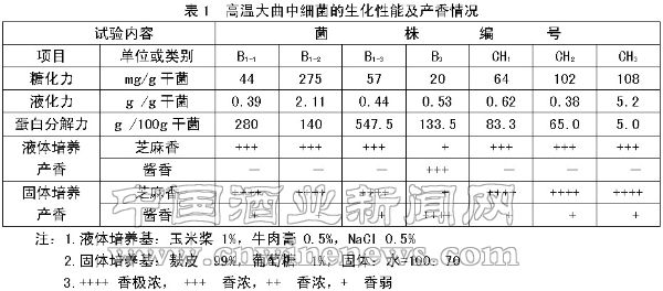 高温嗜热芽孢杆菌,在制曲过程中自始至终存在并占绝对优势,要保证高温细菌的生长繁殖,高温多水的条件必不可少。我们以酱香高温大曲为含菌样品,分离到若干株细菌,其生化性能及产香结果见表1。