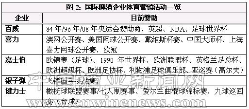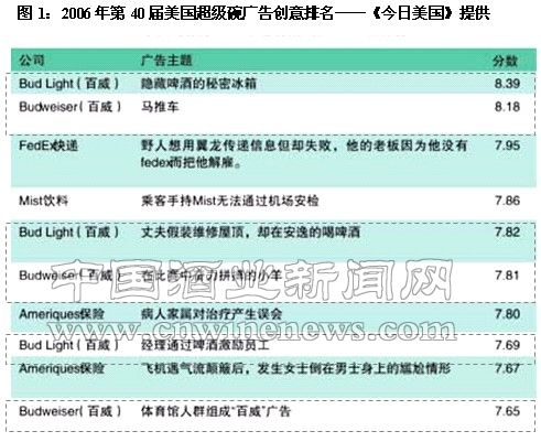 在美国每年的体育盛事——超级碗(年度橄榄球决赛),又被誉为“男人的狂欢夜”,收视率类似中国的春晚,然而在盛会上最引人注目的品牌不是可乐,而是百威啤酒。百威啤酒在06年的超级碗上就曾推出多达六条的不同版本的广告片(如下图1所示)。在在体育营销方面,百威还选择了方程式赛车、曼联队等赞助形式。另外嘉士伯的世界杯、欧洲杯等足球营销也运作了多年,而喜力,除了欧冠外,在中国还选择了上海大师杯网球赛事。