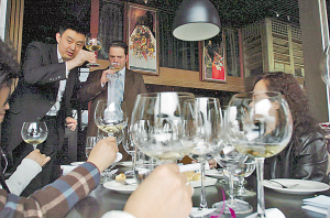 服务生按品酒顺序,给来宾倒上不同的葡萄酒。来宾们纷纷先观察,再闻香、摇杯,再观察、再闻香,最后再品尝。吉娜斯酒庄中国首席代表戴迪博详细讲解了每种葡萄酒的成分、酿造方法和特点,让大家交流感觉。