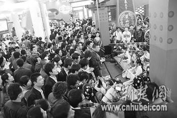 白酒馆内的楚乐演奏,浓郁的楚文化氛围,让参展者犹如置身于春秋战国的楚国,展台前人头攒动,客商云集,尽显楚人豪气。