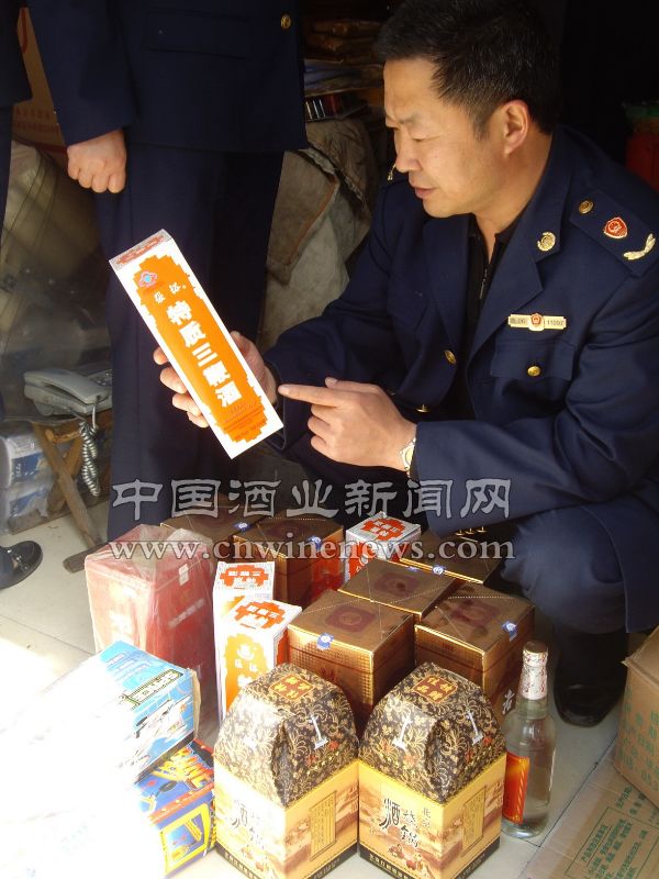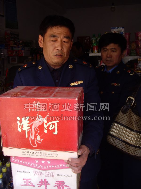 近日,山东省招远市工商局城区工商所执法人员在食品大检查中,查出一些商店、超市中销售“特质三鞭补酒“、“双沟”、“洋河”、“玉井香”等10多种200余瓶无质量认证标志、超期、混浊酒,执法人员文章来源华夏酒报当场进行依法处理,下架扣收。图为执法人员扣收各类假酒。