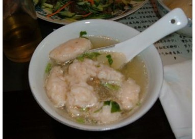 prawn soup in a delicate broth (de-shelled prawns, shaped into ovals a bit like French quenelles, with Chinese chives in a clear soup – i.e. not fish stock)