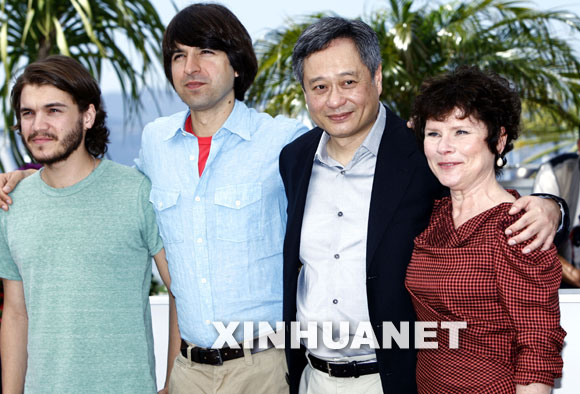 5月16日,影片《制造伍德斯托克音乐节》的男演员埃米尔·赫斯基、迪米特利·马丁、导演李安和女演员伊梅尔达·斯汤顿(从左至右)亮相法国第62届戛纳电影节。新华社记者张玉薇摄