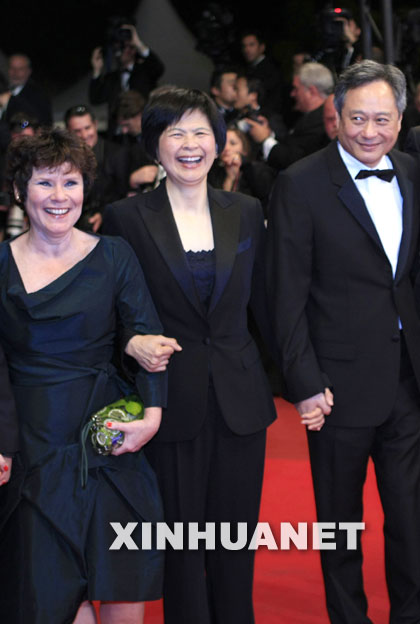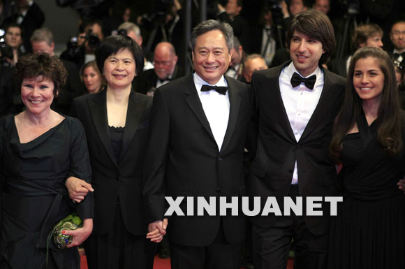5月16日,华人导演李安(右)携夫人(中)与剧组成员共同亮相法国第62届戛纳电影节红地毯。新华社记者张玉薇摄