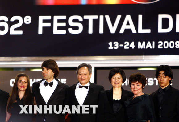 5月16日,华人导演李安(左三)携夫人(左二)与剧组成员共同亮相法国第62届戛纳电影节红地毯。新华社记者张玉薇摄