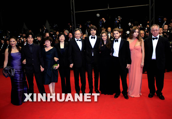 5月16日,华人导演李安(左五)携夫人(左四)与剧组成员共同亮相法国第62届戛纳电影节红地毯。新华社记者张玉薇摄