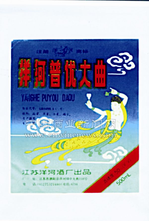 洋河普优大曲酒标,色彩十分艳丽,充满了浪漫情调。当你高举酒杯,斟满美酒,盎然畅饮时,仿佛“飞天”正向你问候,向你敬酒,你会醉意朦胧地和她干杯,陶醉在一种无限美妙的境界……