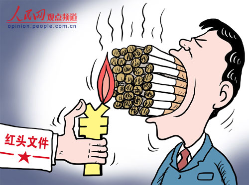 有报道说,早在2001年12月,国务院就公布了《法规规章备案条例》,2004年又发布《全面推进依法行政实施纲要》,都明确要求:对报送备案的规章和规范性文件,政府法制机构应当依法严格审查,做到有件必备、有错必纠。全国31个省、自治区、直辖市也都建立了规范性文件备案制度,实现了县级以上地方各级政府对其所属工作部门和下级政府的规范性文件进行监督——可是,“喝酒文件”、“抽烟文件”的真实故事却告诉人们,什么备案制度,什么监督机制,在不少地方,这些都是“聋子的耳朵——摆设”! “红头文件”可以荒唐雷人、可以为所欲为,而且理由还能很冠冕堂皇:意在引导公务人员为地方经济做贡献!