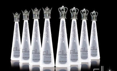 Fillico公司从中蒙受启发,也推出了一款奢华新品,让我们从此深深地记住这一品牌。Fillico 的昂贵之处在于瓶身的霜花装饰图案,由施华洛世奇水晶和黄金涂层完美结合而成,贵气十足,除了瓶人惹人眼球以外,瓶盖设计也叫人惊叹不已,设计师选择两种款式天使翅膀以及皇冠与瓶身相应配备,翅膀和皇冠的制作材料有金、银两种选择。大牌包装设计师的完美设计加上奢华的原材料,足以让你赏心悦目,当你喝完一瓶Fillico之后,更不舍将空瓶扔掉。