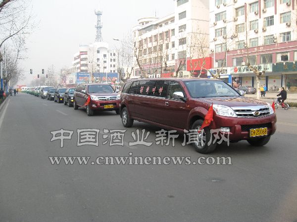 山东兖州兴达酒业有限公司为回报新老客户,推出了提供婚车免费服务活动。凡在婚宴上消费公司产品的客户,公司都免费提供婚礼加长车车队。图为“五一”期间,兴达酒业公司为一对新人的婚礼庆典提供的车队。