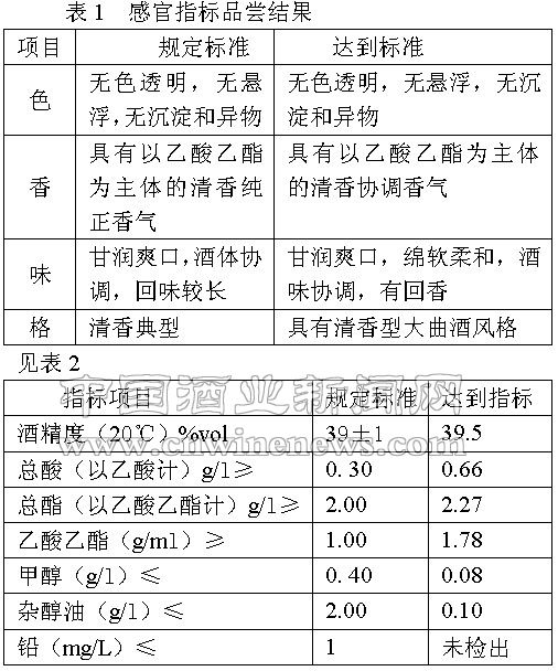通过感官品尝和气相色谱分析相结合的方式,经过上百次的小样勾调试验,筛选出了既能突出清香风格,又照顾后味,酒体协调,并能基本解决各种质量缺陷的勾兑工艺,所勾兑出的样品经组织专业评酒委员品尝后一致认为,质量达到了预定的要求(见表1、表2)。