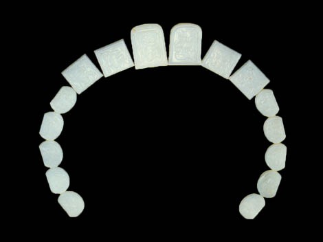 The raw materials for jade pedants are mainly celadonish jade, white jade and yellow jade, among which the suet white jade produced at Hetian, in present-day Xinjiang Uygar Autonomous Region, was the most precious. As for the yellow jade, it was not cheap, anyhow. Emerald was introduced to China in the early Qing Dynasty. It was usually used for producing small articles such as ring face and ear rings due to its small size.