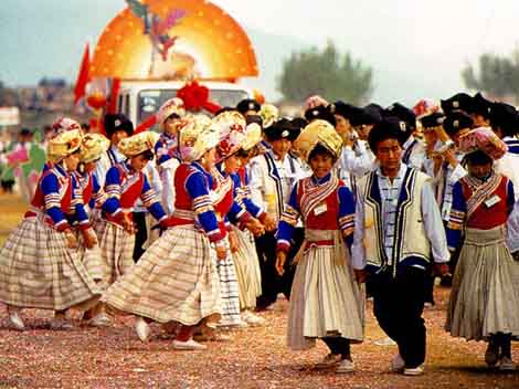 The grandest festival of the Bai people is the March Fair, held annually at the foot of Mt. Cangshan in Dali between the fifteenth and the twentieth day of the third lunar month. Originally it was religious activity to rally and pay homage, but it gradually evolved into a fair including performances of traditional sports and dance, as well as the trade of merchandise from different regions. Another important festival is the Torch Festival, held on the 25th day of the sixth lunar month to wish both health and a good harvest. On that evening, the countryside will be decorated with banners with auspicious words written upon them. Villagers will then light torches in front of their gates, then walk around the fields while holding yet more torches in order to catch pests.