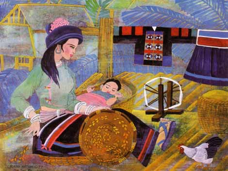 The Blang people are also deft. The areas where they live abound in bamboo and vine, and most of them, even adult men, make use of that and can weave all kinds of baskets to be carried on the back, flower baskets, sieves, mats, and nearly all the furniture such as bamboo-strip tables. Their houses are also made of bamboo, which can be lived in for 20 years. They also make themselves simple blue and black clothes. Men customarily are tattooed, and women wear their hair in a coil, and like to adorn themselves with large ear-rings.