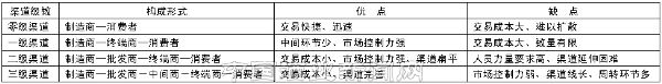 一个企业营销渠道的构成往往有以下几部分组成:企业(制造商)、中间商、终端商、消费者。在这些群体中,由于企业的选择方式不同或者市场的操作模式不同,又分为以下几种表现形式,其优缺点亦各不相同(见表)。
