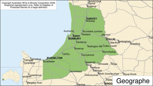 Formally established as a wine region in 1999, Geographe extends through the shires of Harvey, Collie, Dardanup, Donnybrook, Capel and eastern Busselton, and produces wine grapes with full fruit flavours ensuring exciting wines. Tastings are available at 11 facilities in the Donnybrook area, nine in Harvey, eight in the Dardanup-Ferguson Valley and three south of Bunbury.