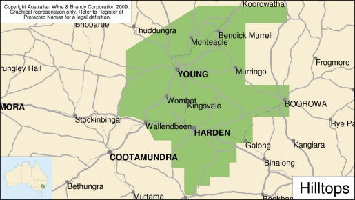 The Hilltops region takes in the shires of Boorowa, Harden and Young, with the majority of the vineyards south-east of Young. All are situated above the 450-metre (1476-feet) contour line.