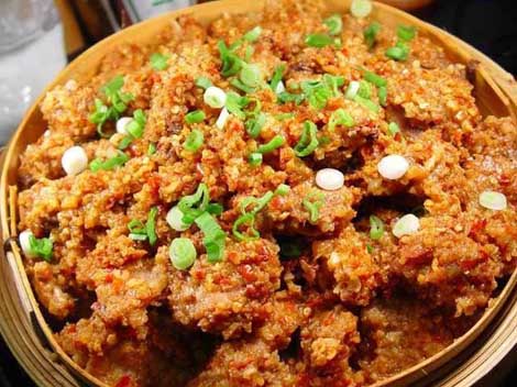As a famous dish in China, it is made by the following steps: slice the side pork into 4 to 5cm long and 5 to 6mm wide; put some sauce, salt, cooking wine, gourmet powder or chicken essence into a vessel (according to the meat content), and more seasonings can be added according to personal taste; prepare the gravy, mix the sliced pork in the vessel and pickle for one to two hours; put the rice flour in, mix the contents and steam the pork on high-temperature fire with some water; the pork shall be turned over for once or twice during the process until it’s done, normally after two hours.