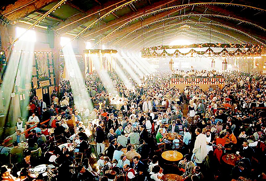 在慕尼黑的泰瑞莎广场上的所有啤酒大棚都是临时搭建的,每个大棚都有2000平方米左右,有独立的舞台和啤酒销售柜台。人们坐在传统的长板凳上,在长木桌前享受着举世闻名的德国啤酒和具有当地特色的烤猪腿。