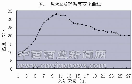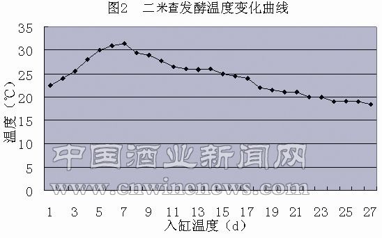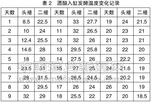 发酵过程中的温度变化是否符合所需要的温度要求,是反映发酵效果的基本要素。通过对不同的入缸条件的调整和控制,对发酵过程中加以细致的管理和采取一定的控温方法,能够较大限度地满足发酵需求,使温度在一个合理的范围内,符合发酵规律进行着演变。试验中温度变化见表2、图1、图2。