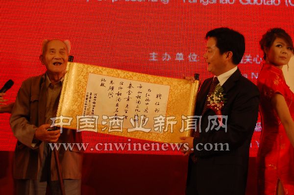 仰韶酒业董事长侯建光向中国百岁老人,酒界泰斗秦含章先生颁发“仰韶酒业名誉总顾问”荣誉证书。