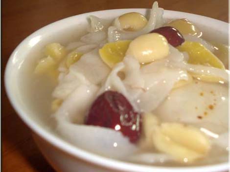 The five-fruit soup is a folk health food in Zhaozhou, where longan, gingko, lotus seeds, pearl barley and lily root are considered spleen-invigorating and health-improving foods. The five fruits were cooked into sweet soup (sometimes the dried persimmon or gordon euryale seed are used for substitute) to make the good Autumn snack. It is called the five-fruit soup.