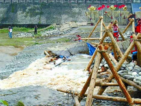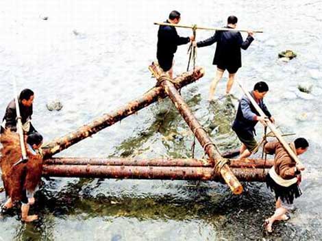 After that, at the order of the officiant followed by three gun salutes, strong workers would cut with full force the ropes tied to the cofferdam blocking the inner river in front of the fish mouth-shaped levee. People on the bench land would strenuously pull the ropes and the cofferdam therefore collapsed, instantly unleashing the river water. At that time, young people would run with the flow and keep throwing stones at the head of the current. This custom was called "hitting the water head". And people would rush to scoop the "head water" and present it to deities as an offering. It was a practice believed to be able to ward off disaster, bring good luck and get blessings from deities.
