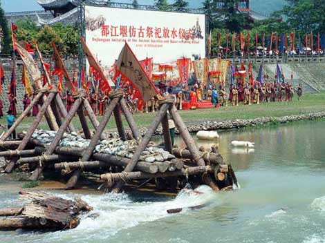 In ancient times, a grand water-releasing ceremony would be held in Dujiangyan on Qingming Festival every year as a wish for a bumper harvest. This ceremony has been kept alive as a tradition in western Sichuan Plain. At the ceremony, local officials are on hand to present the water-releasing spectacle, accompanied by large-scale celebrations.