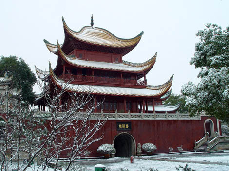The famous Yueyang Tower, located at the western city gate of Yueyang, is one of the three noted towers in the south of the lower reaches of the Yangtze River in China. It is said that the Yueyang Tower was once the parade terrace where Lu Su, a general of the Wu State in the Three Kingdoms Period (220-280), trained the navy. When rebuilt in 1045, Fan Zhongyan was invited to write a poem in memory of the event. In his poem, Fan described the beauty of the structure and indicated his concern about the country and people. The poem was applauded and won the Tower great fame.