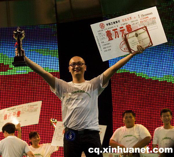 刘亮红以14秒的成绩夺取女子组桂冠 彭博 摄 昨晚,在渝中区大田湾体育场举行了第七届中国重庆国际啤酒饮料节"山城啤酒杯"啤酒竞饮大赛决赛。市民们在狂欢与啤酒中渡过了一个真正属于他们的难忘节日。 4.13秒再创记录 经过之前的预塞及半决赛,有20名闯入决赛的选手参加了单人啤酒限量比速赛。经过一番激烈的角逐,黄智荣以4.13秒内喝完1000毫升的成绩轻松拿下男子组冠军,刘亮红则以14秒的成绩夺取女子组桂冠。 据悉,男子啤酒竞饮个人限量1000毫升竞速纪录,是上届冠军赖正飞创造的4.84秒。这次黄智荣一举打破了记录,成为了啤酒节限量1000毫升竞速记录的最新保持者。 对于如何在4.13秒这个不可思议的时间段内喝完那么大一杯啤酒,黄智荣认为更多是天生的,"真的要说技巧,那就抽水马桶一个道理咯--不是倒,是吸。" 啤酒节变泼酒节 由于主办方的演出使得现场的气氛一度极其高涨,不少市民选择了用他们酒杯里的啤酒来表达内心尽情欢腾的快乐。 在现场不时可以看到用啤酒互相泼洒的市民,整个会场就像在下"啤酒雨"。随着啤酒仗波及范围的扩大,几乎整个大田湾体育场都浸泡在啤酒的泡沫之中。不少人浑身上下都被啤酒浇了个透,而许多女士则是纷纷撑开了自带的雨伞。 一位手拿啤酒杯,浑身都是啤酒的小伙子告诉记者,整个啤酒节最让人开心的就是这个泼酒的环节。能够痛痛快快地放下很多束缚尽情欢乐,巴适得很。