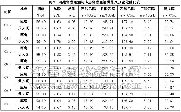 总酸的增加和总酯的减少说明主要是水解反应所致。山洞中常年恒温恒湿促进了反应的进行,而库房中冬天温度低,水解反应变慢了。