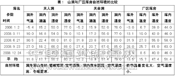 由表1看出,天人洞和天合洞的洞内酒温基本上稳定在16℃—23℃之间,而厂区库房内酒温在7℃—27℃之间,温差变化大;洞内湿度高,为75%—88%,这是受洞内泉水影响所致,而库房内湿度均在44%—63%之间,湿度较小。经我们跟踪测量,在晴天有风的春天,库房内湿度最低达到25%,而山洞内看似干燥的春天,洞内湿度也达到了75%以上。