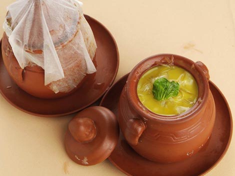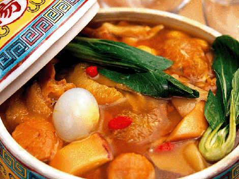 This is a well-known dish of Fuzhou.It is made of an assortment of materials: shark's fin, shark's lip, fish maw, abalone, squid, sea cucumber, chicken breast, duck chops, pork tripe, pork leg, minced ham, mutton elbow, dried scallop, winter bamboo shoots, xianggu mushrooms, and soon, These are seasoned and steamed separately and then put into a small-mouthed clay jar together with cooking wine and a dozen or so boiled pigeon eggs. The jar is covered and put on intense fire first and then simmered for some time on slow fire. Four or five ounces of a local liquor is added into the jiar,which is kept simmering for another five minutes. Then the dish is ready.