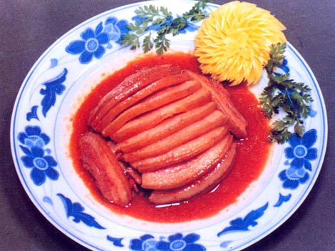 3. Stack the pork slices, skin side down, in a large bowl and pour the rest of the paste over them. Add the scallion, ginger, and rice wine. Cover the bowl tightly with a dish. Place the bowl in a steamer and steam over boiling water for 3 hours over a high fire, adding water when necessary, until the meat becomes very tender. Remove the bowl from the steamer. Discard the scallions and ginger. Cover the bowl with a serving dish and invert both so the pork slides into the dish with the skin side up. Serve.