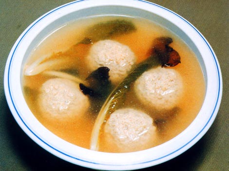 1. Mince the pork if it is not already ground. Add the egg white, rice wine, MSG, and salt, and stir to mix. Add the cornstarch and mix well. Shape lightly into four equal-sized balls.