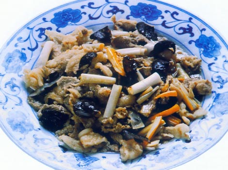 3. Add the soy sauce, wood ears, MSG, and scallions. Stir-fry for 2 more minutes, remove, and serve.