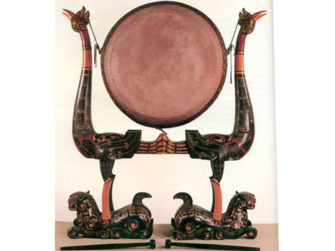 Of the musical instruments used in the imperial court of the Spring and Autumn and Warring States Period, bronze chime-bells and stone chimes are the major pieces, but drums are also important instruments. One of the drums is a drum with bird frames and tiger base.