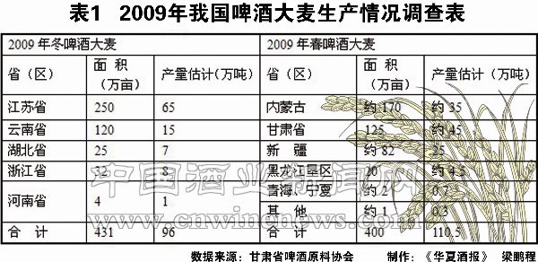 据介绍,全国冬播和春播啤酒大麦的种植面积均比年初文章来源华夏酒报统计数有所减少。其中冬啤酒大麦种植面积431万亩、产量96万吨,分别比年初统计和预测数下降4.3%和2%;春啤酒大麦种植面积400万亩左右,产量估计为110万吨,面积和产量与2004年相当,为近6年来首次滑落。由表1可见:2009年大麦实际种植面积和预计产量分别比2008年的1230万亩和344万吨减少32%和40%;预测可作为商品啤酒大麦的总量估计只有160万吨左右。面积下降最多的在春大麦主产区,分别是内蒙古、甘肃、新疆、黑龙江垦区等,下降幅度在30%—55%之间。