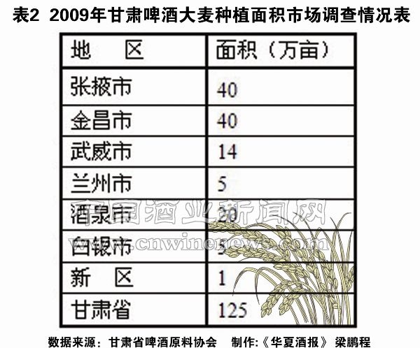 甘肃今年啤酒大麦种植面积由2008年的200多万亩下降到年初统计数的130万亩。但实际种植面积可能在125万亩左右;河西走廊主产区旱情较重,减产已成定局,单产平均减幅有可能在10%—20%之间。全省啤酒大麦总产估计不到50万吨。(表2是2009年甘肃啤酒大麦种植面积市场调查情况表。注:1、酒泉、张掖、金昌、武威四地市含农垦所在地种植面积。2、新区包括:章县、临潭、合作、康乐、和政、临夏、积石山。)