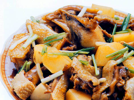 1. Wash the chicken and chop and chop into 1 1/2 inch (4 cm) pieces. Peel the yam or potatoes and roll-cut diagonally into 1 1/2 inch (4 cm) pieces.
