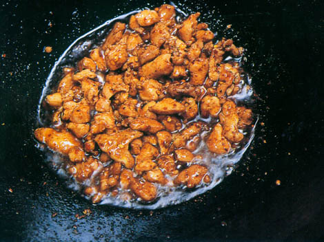 3. Heat the oil in a wok over high heat to 225degrees Fahrenheit (110 degrees Celsius), or until small bubbles appear around the edge of a piece of scallion green or ginger tossed into the oil. Add the chicken and chili pepper and stir-fry until the chicken turns red (see Illustration I).