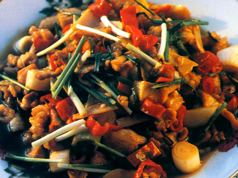 4. Add the ginger, water chestnuts, scallions and garlic, and fry until fragrant. Stir in the sauce and sprinkle with the vinegar. Stir-fry about 30 seconds. Remove, and serve.