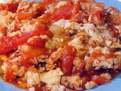 3. Heat 2 tbsp of the oil in a wok over high heat until the oil surface ripples. Pour in the eggs and cool, stirring constantly, until thickened. Remove from the wok and place in a dish. Add the other 2 tbsp of oil to the wok and reheat until very hot. Add the scallions and ginger and stir-fry for a few seconds. Then add the tomato, the remaining salt, sugar and MSG. Stir-fry about 30 seconds, then return the scrambled eggs to the wok. Stir to blend, remove, and serve.