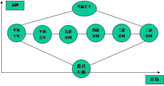 河南宋河在广告公司与咨询公司推波助澜下,已经是扎扎实实地成为一个多核心品牌白酒企业。目前,宋河着力培养的主要有共赢天下,宋河粮液,鹿邑大曲三个核心战略型品牌,这三个核心品牌无论是产品命名上,还是品牌定位上,抑或是市场定位上都完全独立的。并且,在核心品牌均形成产品系列。这三个品牌也是完全不同的。其中共赢天下---作为宋河酒业超高端核心品牌产品数量上比较少,形成的产品具备点状特征;鹿邑大曲---作为宋河酒业相对低端核心品牌,产品数量上也比较少,构成点状特征;而宋河粮液----作为宋河酒业核心中档品牌,产品数量众多,三个核心品牌构成了菱形面。