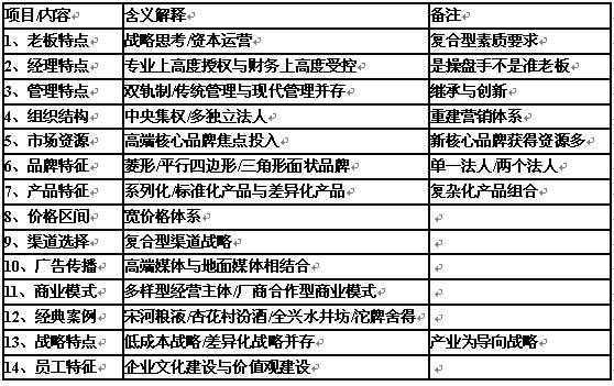 3)、多法人公司运营商业模式,如全兴水井坊,沱牌舍得酒等。这种经营模式实际上可以做到最大化企业利益,同时也可以做到市场管理的严谨性,因此,未来多核心品牌的面状结构化战略,建议采取多法人结构运营模式,这样更加容易取得成功。