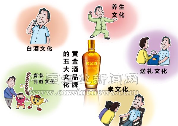 以黄金酒为例来说,黄金酒的品牌文化是什么呢?就是这五大文化: