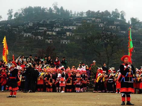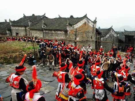 As a grand festival for worshiping Pan Hu, a remote ancestor of the Yao ethnic minority, King Pan Festival is evolved from the "Dance of King Pan" which was directed at expressing appreciation to King Pan for his favor and also praying for offspring's safety by means of singing and dancing. During the festival, people of the Yao ethnic group will sing the Song of King Pan and perform tambourin dance to worship the ancestor, in combination with a series of celebrating activities such as performance of devil stick dance and shooting off festival fireworks. Young men and women will single out their dream lovers in the antiphonal singing contests.