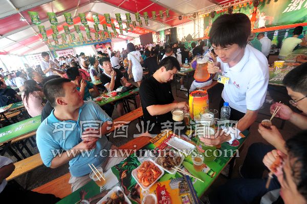 8月15日,游客正在啤酒节上品饮用餐。